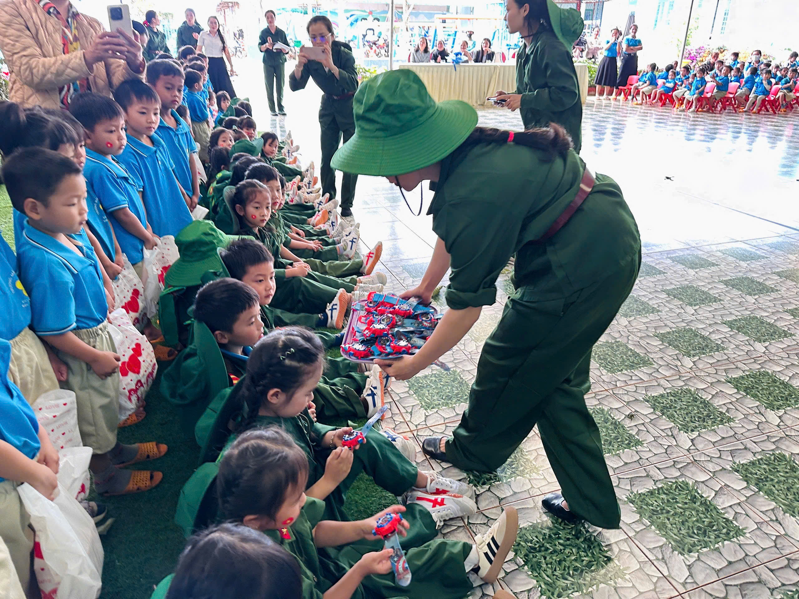 Điểm nhấn đầy yêu thương của chương trình là hoạt động trao quà cho các bé có hoàn cảnh khó khăn, thể hiện sự quan tâm, sẻ chia của nhà trường, giáo viên và phụ huynh, góp phần gieo vào lòng trẻ những hạt mầm nhân ái, biết yêu thương và giúp đỡ bạn bè.